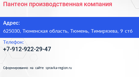 Пантеон, производственная компания по адресу 625030, Тюменская область, Тюмень, Тимирязева, 9 ст6 в дальнейшем Организация, размещена в следующих категориях: