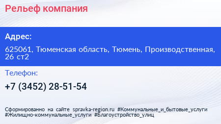 Рельеф, компания по адресу 625061, Тюменская область, Тюмень, Производственная, 26 ст2 в дальнейшем Организация, размещена в следующих категориях: