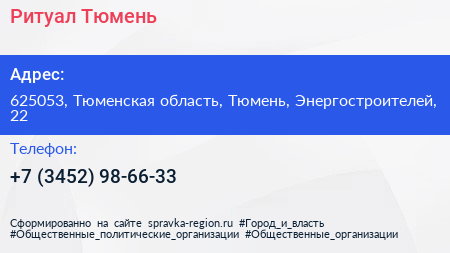 Ритуал Тюмень по адресу 625053, Тюменская область, Тюмень, Энергостроителей, 22 в дальнейшем Организация, размещена в следующих категориях: