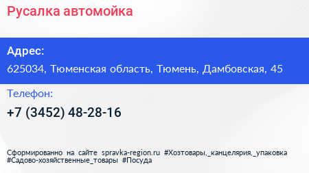 Русалка, автомойка по адресу 625034, Тюменская область, Тюмень, Дамбовская, 45 в дальнейшем Организация, размещена в следующих категориях: