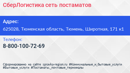 СберЛогистика, сеть постаматов по адресу 625028, Тюменская область, Тюмень, Широтная, 171 к1 в дальнейшем Организация, размещена в следующих категориях: