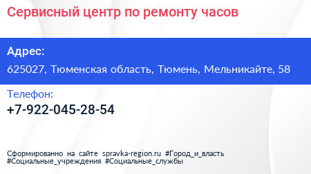 Сервисный центр по ремонту часов по адресу 625027, Тюменская область, Тюмень, Мельникайте, 58 в дальнейшем Организация, размещена в следующих категориях: