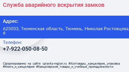 Служба аварийного вскрытия замков по адресу 625033, Тюменская область, Тюмень, Николая Ростовцева, 6 в дальнейшем Организация, размещена в следующих категориях: