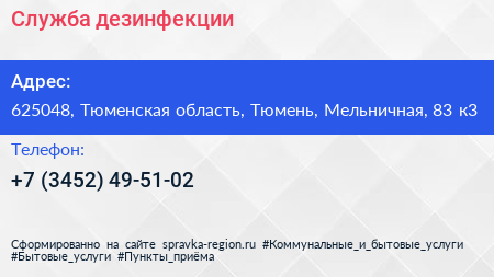 Служба дезинфекции по адресу 625048, Тюменская область, Тюмень, Мельничная, 83 к3 в дальнейшем Организация, размещена в следующих категориях: