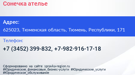 Сонечка, ателье по адресу 625023, Тюменская область, Тюмень, Республики, 171 в дальнейшем Организация, размещена в следующих категориях: