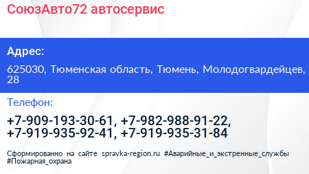СоюзАвто72, автосервис по адресу 625030, Тюменская область, Тюмень, Молодогвардейцев, 28 в дальнейшем Организация, размещена в следующих категориях:
