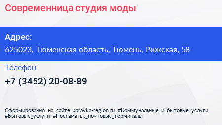 Современница, студия моды по адресу 625023, Тюменская область, Тюмень, Рижская, 58 в дальнейшем Организация, размещена в следующих категориях: