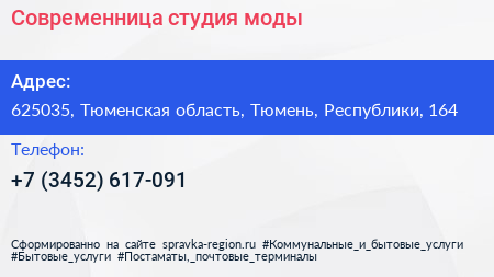Современница, студия моды по адресу 625035, Тюменская область, Тюмень, Республики, 164 в дальнейшем Организация, размещена в следующих категориях: