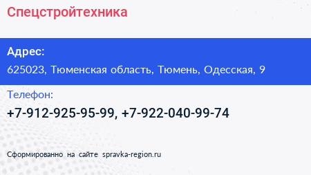 Спецстройтехника по адресу 625023, Тюменская область, Тюмень, Одесская, 9 в дальнейшем Организация, размещена в следующих категориях: