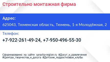 Строительно-монтажная фирма по адресу 625043, Тюменская область, Тюмень, 1-я Молодёжная, 2 в дальнейшем Организация, размещена в следующих категориях: