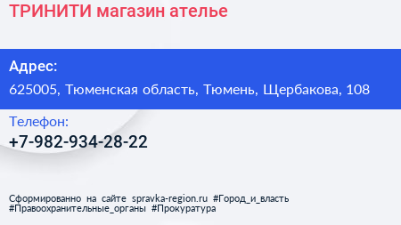 ТРИНИТИ, магазин-ателье по адресу 625005, Тюменская область, Тюмень, Щербакова, 108 в дальнейшем Организация, размещена в следующих категориях: