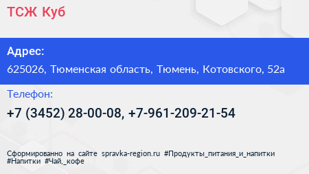 ТСЖ Куб по адресу 625026, Тюменская область, Тюмень, Котовского, 52а в дальнейшем Организация, размещена в следующих категориях: