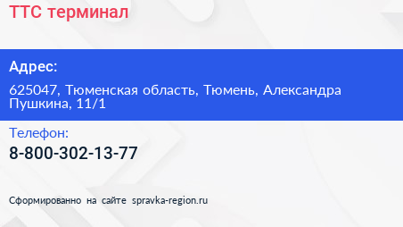 ТТС, терминал по адресу 625047, Тюменская область, Тюмень, Александра Пушкина, 11/1 в дальнейшем Организация, размещена в следующих категориях: