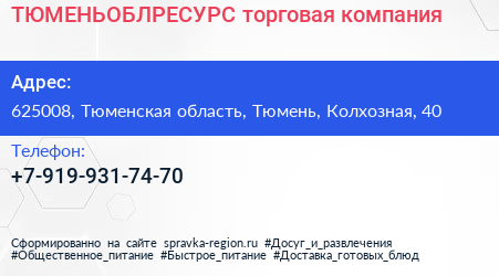 ТЮМЕНЬОБЛРЕСУРС, торговая компания по адресу 625008, Тюменская область, Тюмень, Колхозная, 40 в дальнейшем Организация, размещена в следующих категориях: