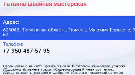 Татьяна, швейная мастерская по адресу 625048, Тюменская область, Тюмень, Максима Горького, 3 к2 в дальнейшем Организация, размещена в следующих категориях:
