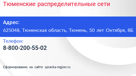 Тюменские распределительные сети по адресу 625048, Тюменская область, Тюмень, 50 лет Октября, 8Б в дальнейшем Организация, размещена в следующих категориях: