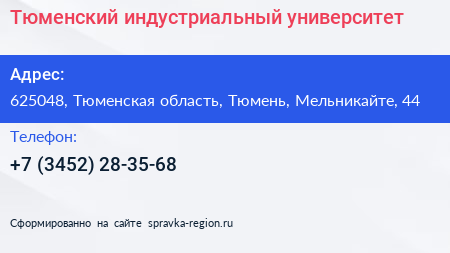 Тюменский индустриальный университет по адресу 625048, Тюменская область, Тюмень, Мельникайте, 44 в дальнейшем Организация, размещена в следующих категориях: