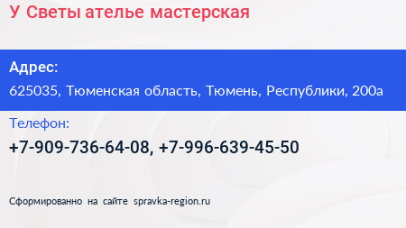У Светы, ателье-мастерская по адресу 625035, Тюменская область, Тюмень, Республики, 200а в дальнейшем Организация, размещена в следующих категориях: