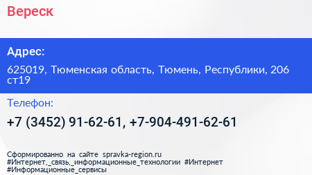 Вереск по адресу 625019, Тюменская область, Тюмень, Республики, 206 ст19 в дальнейшем Организация, размещена в следующих категориях: