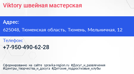 Viktory, швейная мастерская по адресу 625048, Тюменская область, Тюмень, Мельничная, 12 в дальнейшем Организация, размещена в следующих категориях:
