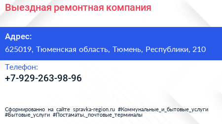 Выездная ремонтная компания по адресу 625019, Тюменская область, Тюмень, Республики, 210 в дальнейшем Организация, размещена в следующих категориях: