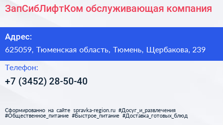 ЗапСибЛифтКом, обслуживающая компания по адресу 625059, Тюменская область, Тюмень, Щербакова, 239 в дальнейшем Организация, размещена в следующих категориях: