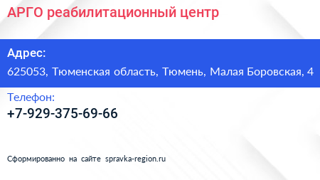 АРГО, реабилитационный центр по адресу 625053, Тюменская область, Тюмень, Малая Боровская, 4 в дальнейшем Организация, размещена в следующих категориях: