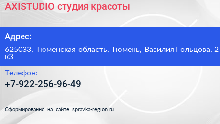 AXISTUDIO, студия красоты по адресу 625033, Тюменская область, Тюмень, Василия Гольцова, 2 к3 в дальнейшем Организация, размещена в следующих категориях: