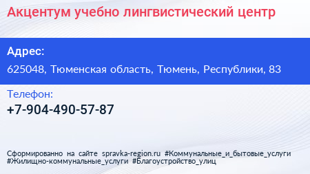 Акцентум, учебно-лингвистический центр по адресу 625048, Тюменская область, Тюмень, Республики, 83 в дальнейшем Организация, размещена в следующих категориях: