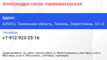 Александра, салон-парикмахерская по адресу 625013, Тюменская область, Тюмень, Энергетиков, 53 к1 в дальнейшем Организация, размещена в следующих категориях: