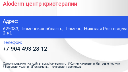 Aloderm, центр криотерапии по адресу 625033, Тюменская область, Тюмень, Николая Ростовцева, 2 к1 в дальнейшем Организация, размещена в следующих категориях: