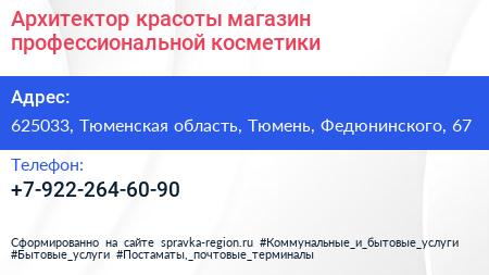 Архитектор красоты, магазин профессиональной косметики по адресу 625033, Тюменская область, Тюмень, Федюнинского, 67 в дальнейшем Организация, размещена в следующих категориях: