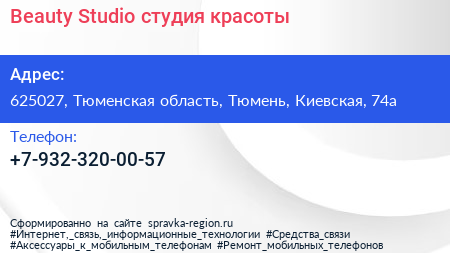 Beauty Studio, студия красоты по адресу 625027, Тюменская область, Тюмень, Киевская, 74а в дальнейшем Организация, размещена в следующих категориях: