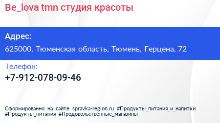 Be_lova.tmn, студия красоты по адресу 625000, Тюменская область, Тюмень, Герцена, 72 в дальнейшем Организация, размещена в следующих категориях: