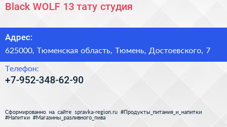 Black WOLF 13, тату-студия по адресу 625000, Тюменская область, Тюмень, Достоевского, 7 в дальнейшем Организация, размещена в следующих категориях: