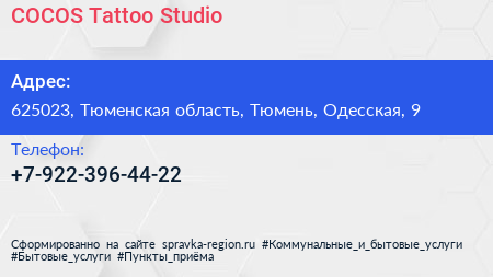 COCOS Tattoo Studio по адресу 625023, Тюменская область, Тюмень, Одесская, 9 в дальнейшем Организация, размещена в следующих категориях: