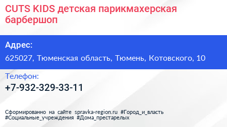CUTS KIDS, детская парикмахерская-барбершоп по адресу 625027, Тюменская область, Тюмень, Котовского, 10 в дальнейшем Организация, размещена в следующих категориях: