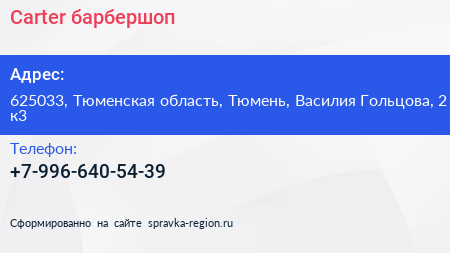 Carter, барбершоп по адресу 625033, Тюменская область, Тюмень, Василия Гольцова, 2 к3 в дальнейшем Организация, размещена в следующих категориях:
