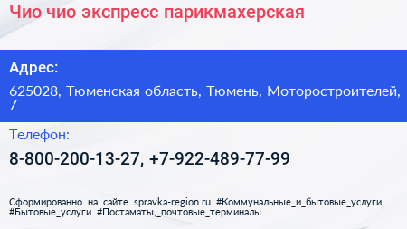 Чио чио, экспресс-парикмахерская по адресу 625028, Тюменская область, Тюмень, Моторостроителей, 7 в дальнейшем Организация, размещена в следующих категориях: