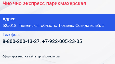 Чио чио, экспресс-парикмахерская по адресу 625018, Тюменская область, Тюмень, Созидателей, 5 в дальнейшем Организация, размещена в следующих категориях: