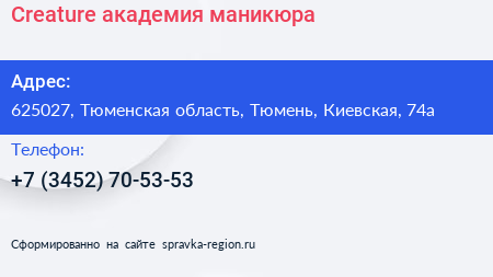 Creature, академия маникюра по адресу 625027, Тюменская область, Тюмень, Киевская, 74а в дальнейшем Организация, размещена в следующих категориях: