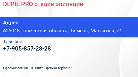 DEPIL.PRO, студия эпиляции по адресу 625048, Тюменская область, Тюмень, Малыгина, 71 в дальнейшем Организация, размещена в следующих категориях: