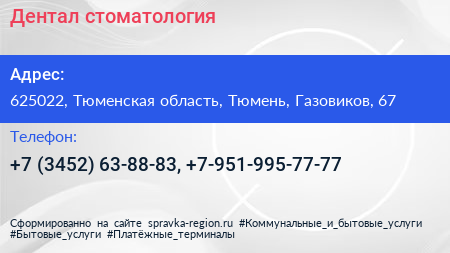 Дентал, стоматология по адресу 625022, Тюменская область, Тюмень, Газовиков, 67 в дальнейшем Организация, размещена в следующих категориях: