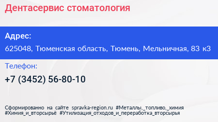 Дентасервис, стоматология по адресу 625048, Тюменская область, Тюмень, Мельничная, 83 к3 в дальнейшем Организация, размещена в следующих категориях: