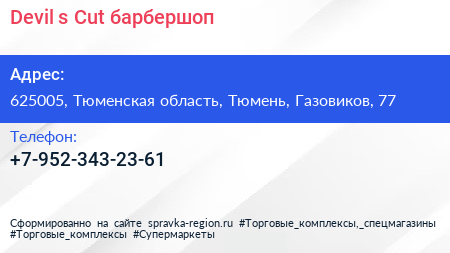 Devil`s Cut, барбершоп по адресу 625005, Тюменская область, Тюмень, Газовиков, 77 в дальнейшем Организация, размещена в следующих категориях: