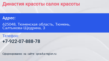 Династия красоты, салон красоты по адресу 625048, Тюменская область, Тюмень, Салтыкова-Щедрина, 3 в дальнейшем Организация, размещена в следующих категориях: