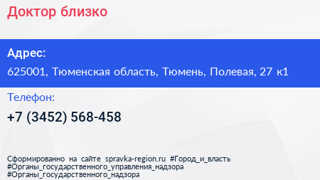 Доктор близко по адресу 625001, Тюменская область, Тюмень, Полевая, 27 к1 в дальнейшем Организация, размещена в следующих категориях: