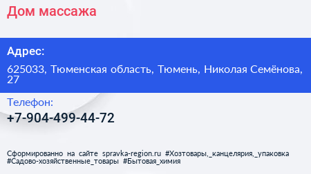 Дом массажа по адресу 625033, Тюменская область, Тюмень, Николая Семёнова, 27 в дальнейшем Организация, размещена в следующих категориях: