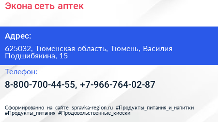 Экона, сеть аптек по адресу 625032, Тюменская область, Тюмень, Василия Подшибякина, 15 в дальнейшем Организация, размещена в следующих категориях: