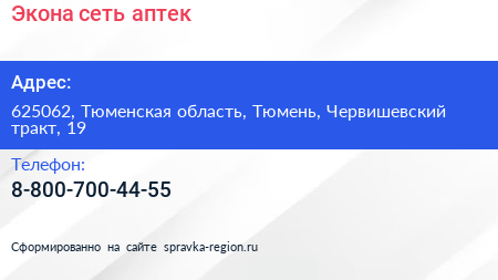 Экона, сеть аптек по адресу 625062, Тюменская область, Тюмень, Червишевский тракт, 19 в дальнейшем Организация, размещена в следующих категориях: